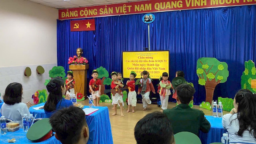Thông qua các hoạt động như nghe kể chuyện, xem tranh ảnh, hát múa và trò chơi vận động theo chủ đề, các cháu được giáo dục lòng yêu quê hương, biết ơn những người bảo vệ Tổ quốc, góp phần tạo không khí vui tươi, ý nghĩa trong nhà trường.